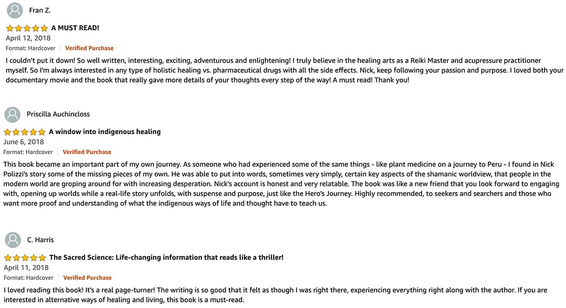 “In The Sacred Science, Nick Polizzi tells a riveting tale of exploration, hope, and wonder through his adventures into the Amazon. A regular guy from Connecticut follows his own health journey and finds the earth’s greatest treasure – forgotten healing plants and the native cultures who know how to use them. It was hard to put this book down and the ending delivered a wallop that everyone needs to experience.”